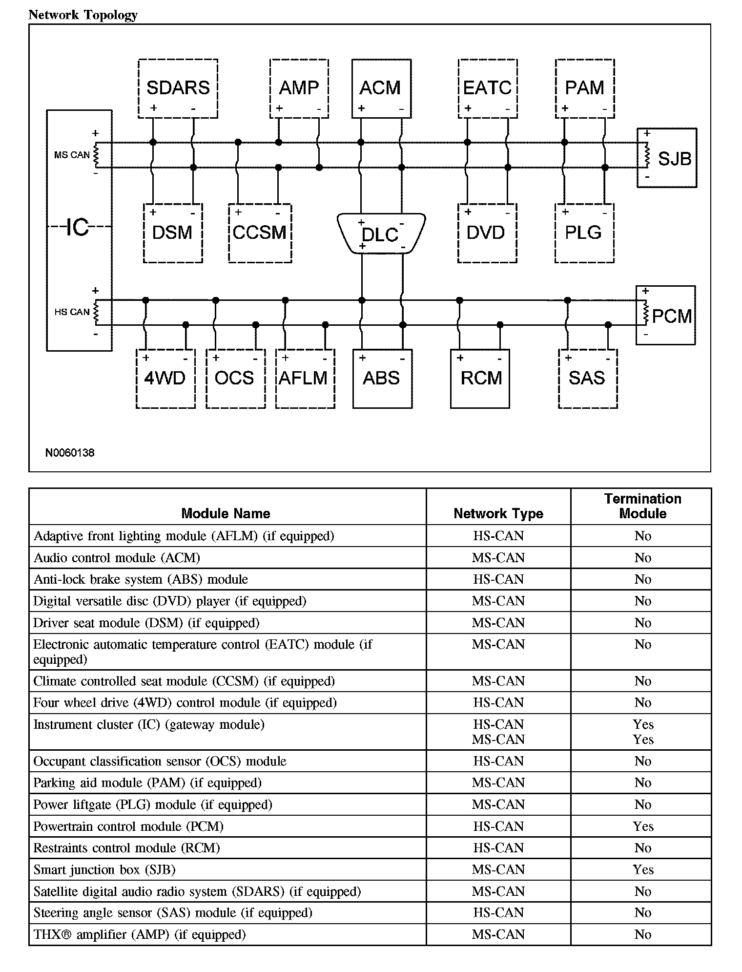 The instrument cluster is the gateway module, translating HS-CAN to MS-CAN and vice versa. This information allows a message to be distributed throughout both networks. The instrument cluster is the only module on this vehicle that has this ability.