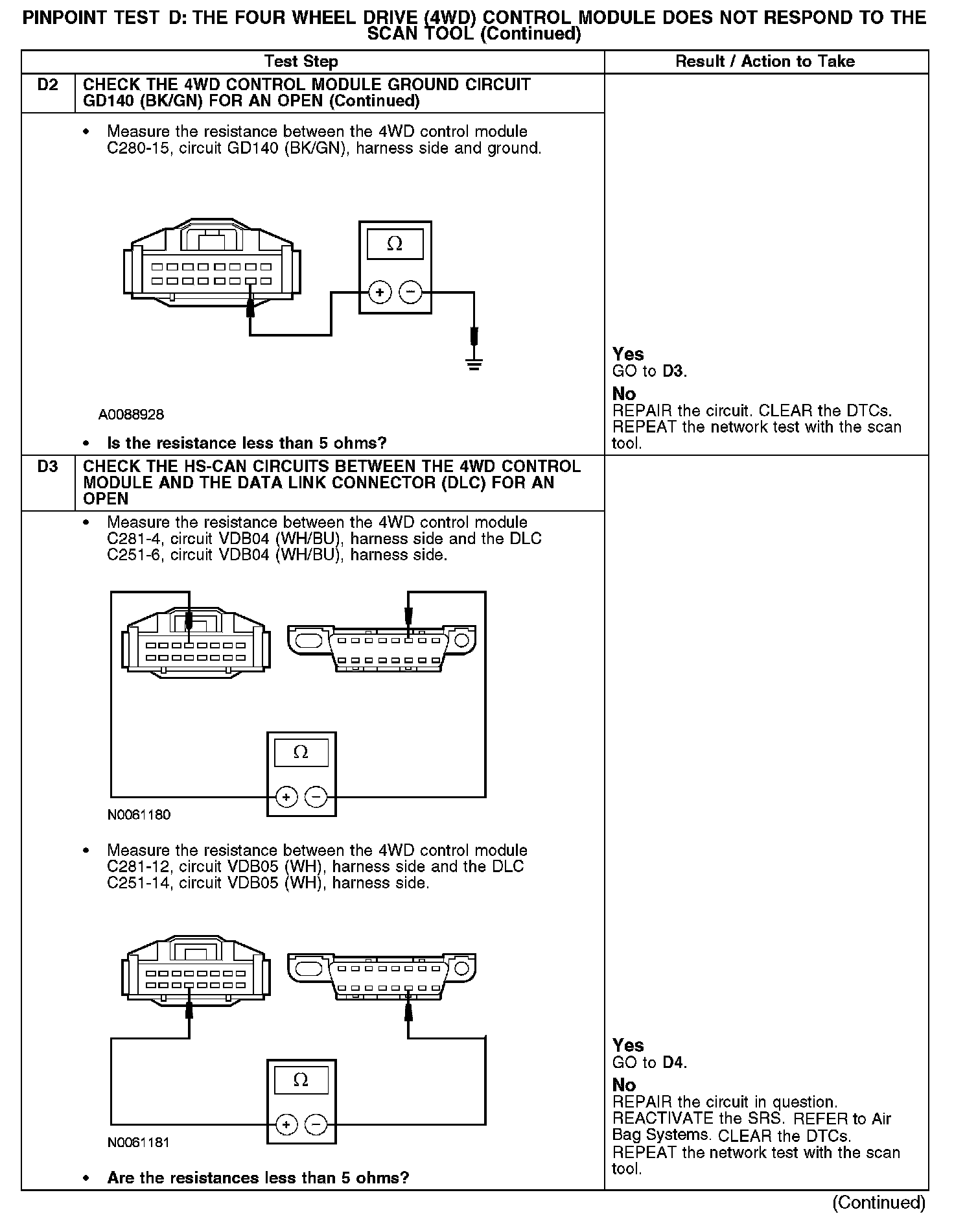 The 4WD control module communicates with the scan tool through the high speed controller area network (HS-CAN). Circuits VDB04 (WH/BU) (HS-CAN +) and VDB05 (WH) (HS-CAN -) provide the network connection to the 4WD control module. The 4WD control module shares the HS-CAN network with the PCM, the ABS module, the occupant classification sensor module, the restraints control module (RCM), the adaptive front lighting module (if equipped), the steering angle sensor module (if equipped) and the instrument cluster. Voltage is supplied by circuits CBP35 (YE/GY) and SBP11 (BU/RD). Ground is supplied by circuit GD140 (BK/GN).