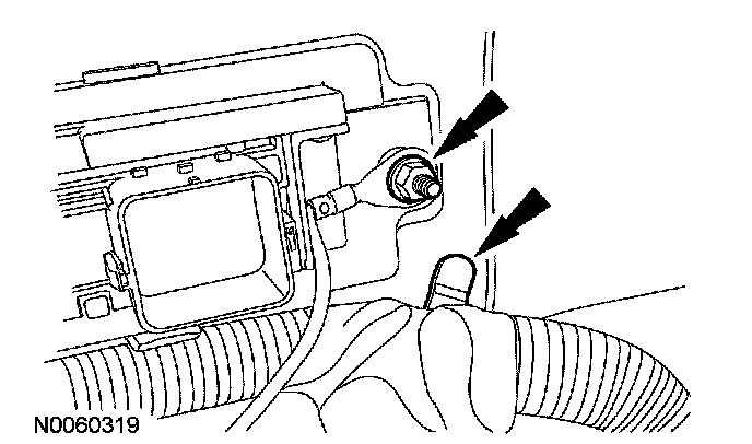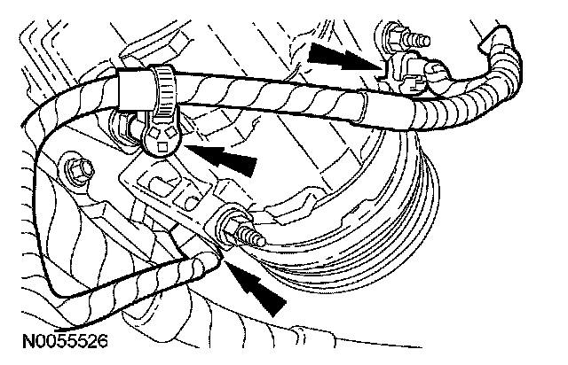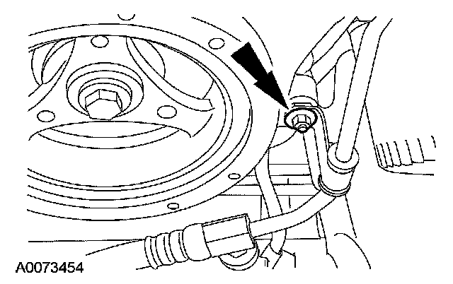 15. Connect the wiring harness position retainer to the power steering pump stud bolt.