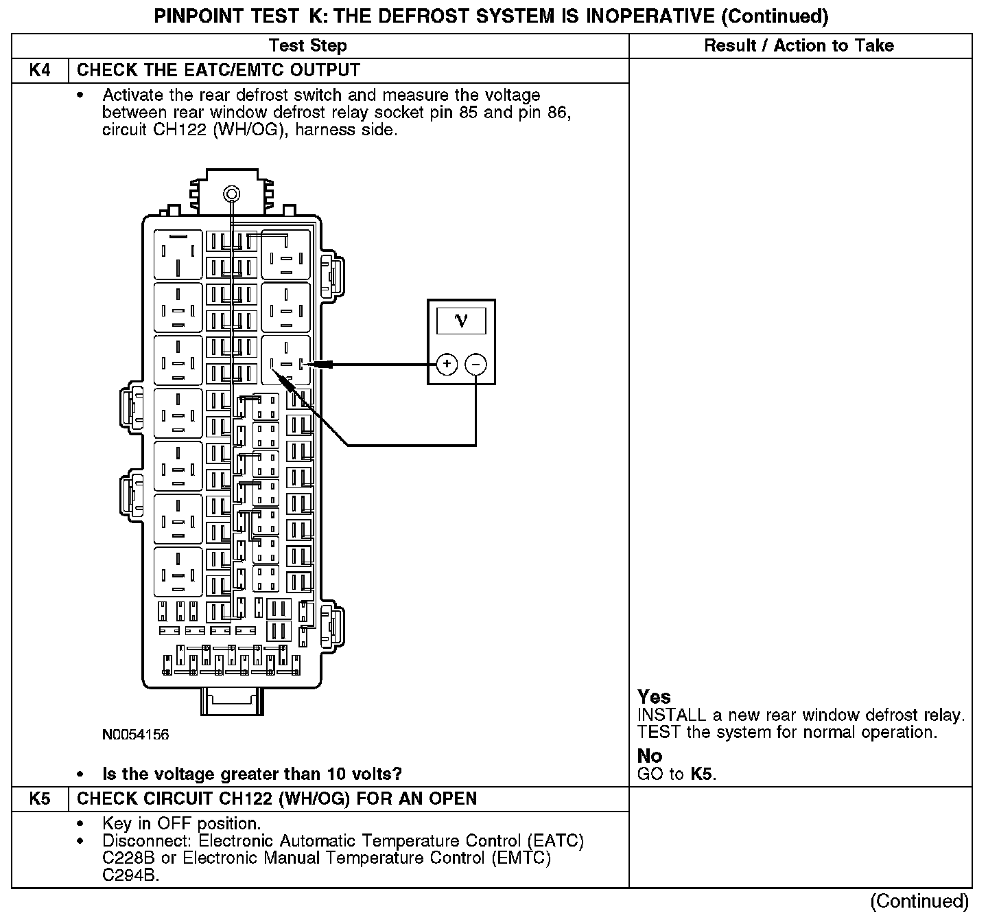 During normal operation, the electronic automatic temperature control (EATC) module or electronic manual temperature control (EMTC) activates the rear window defrost relay by grounding the relay coil through circuit CH122 (WH/OG). When the defrost relay is activated, power is supplied from the relay to the rear window defrost grid through circuit CRD06 (BN/YE) and also to the LH/RH exterior rear view mirror heaters through circuit CBB23 (BN/YE). Ground is supplied to the rear window defrost grid and exterior mirror heaters through circuit GD150 (BK/WH).