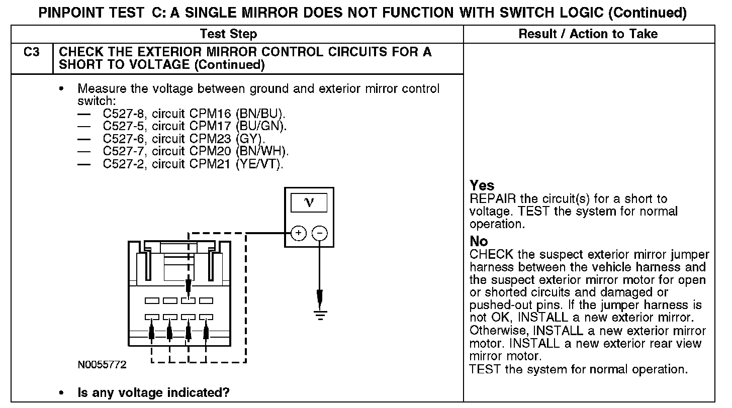 - When ground is received through circuit CPM16 (BN/BU)/CPM20 (BN/WH) and power through circuit CPM23 (GY), the LH/RH exterior mirror will operate left.