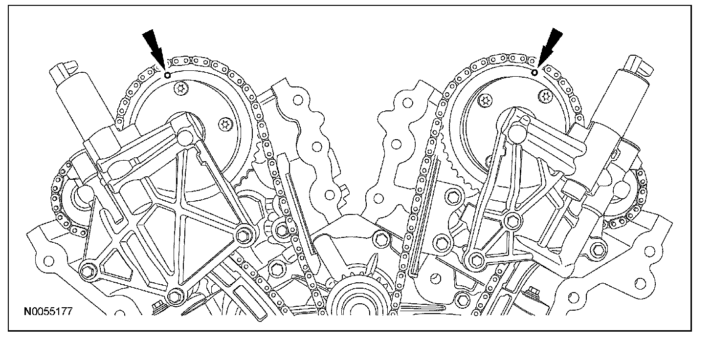 2. Rotate the crankshaft clockwise and align the timing marks on the variable camshaft timing (VCT) assemblies as shown.