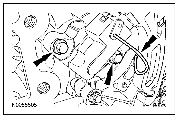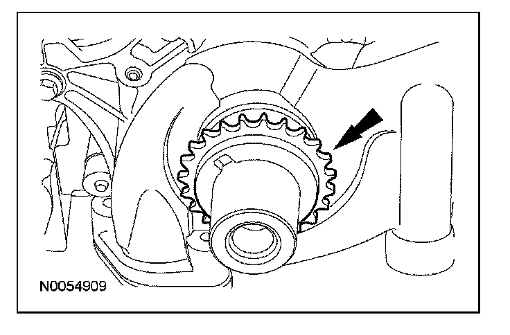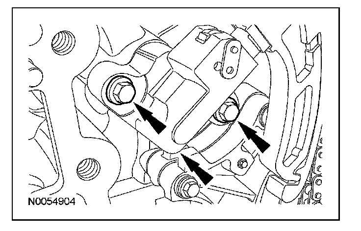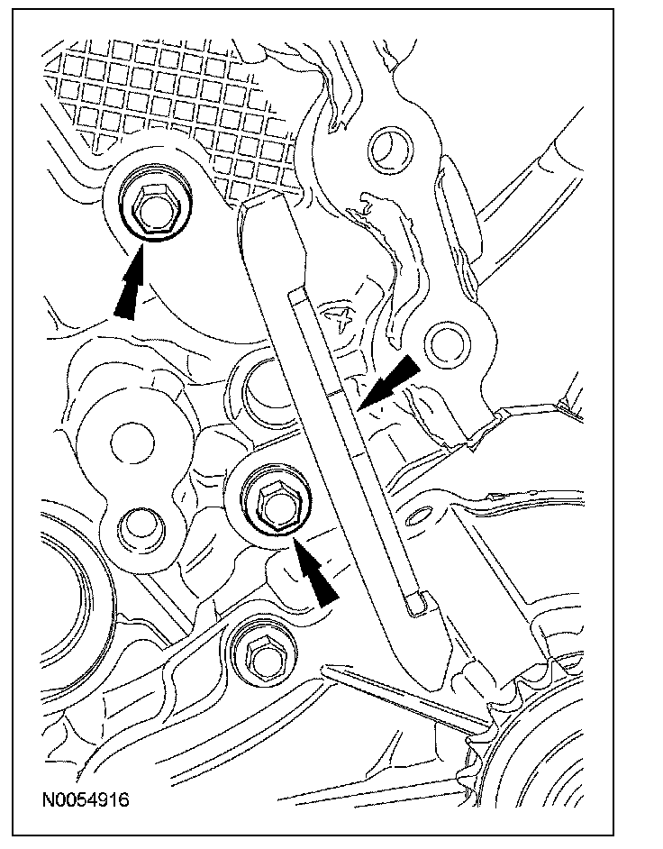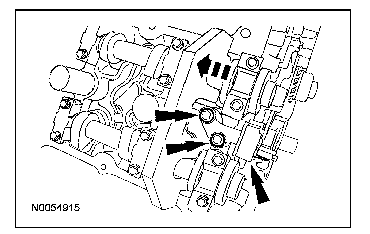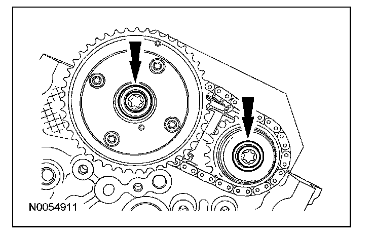 18. NOTE: The VCT bolt and the exhaust camshaft bolt must be discarded and new ones installed. However, the exhaust camshaft washer is reusable.