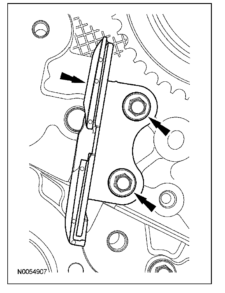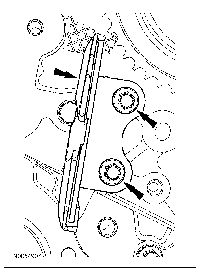 10. Remove the 2 bolts and the lower LH primary timing chain guide.