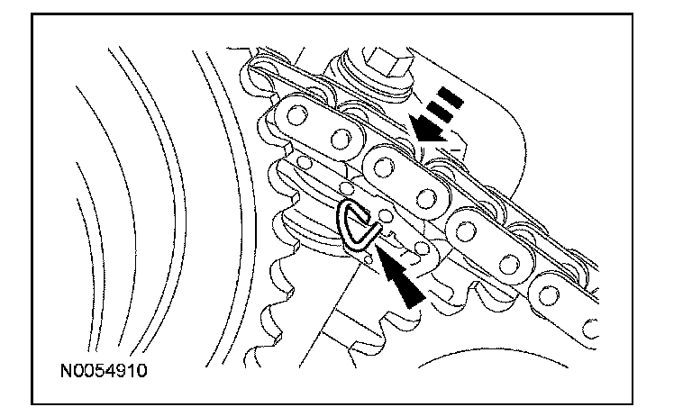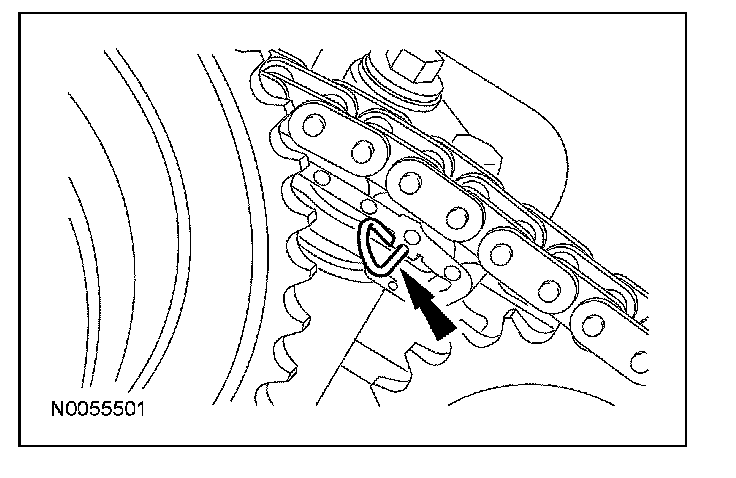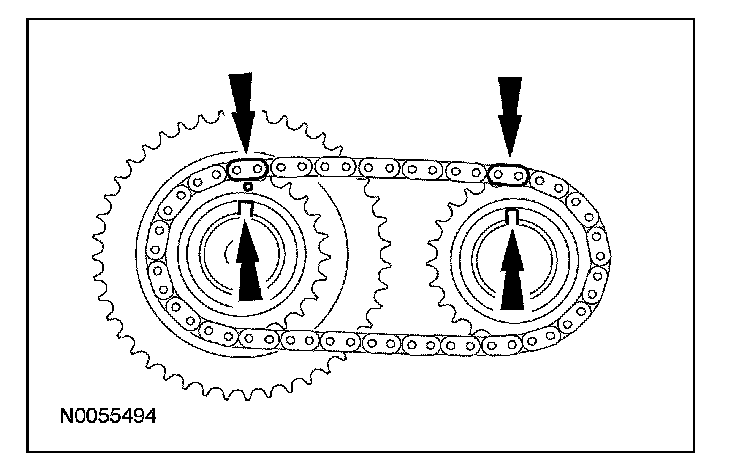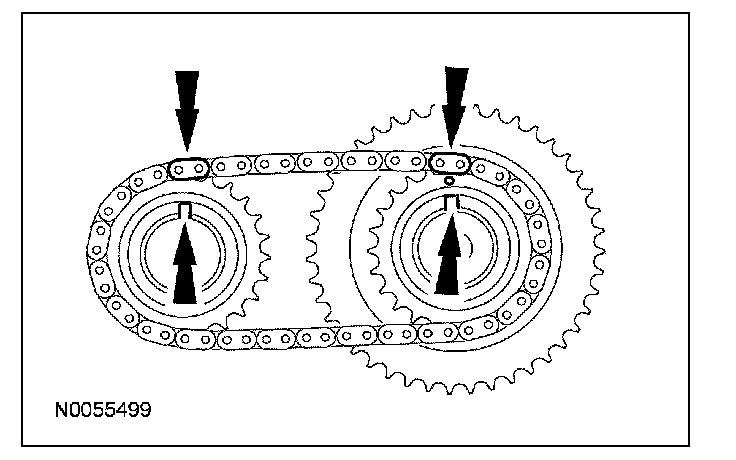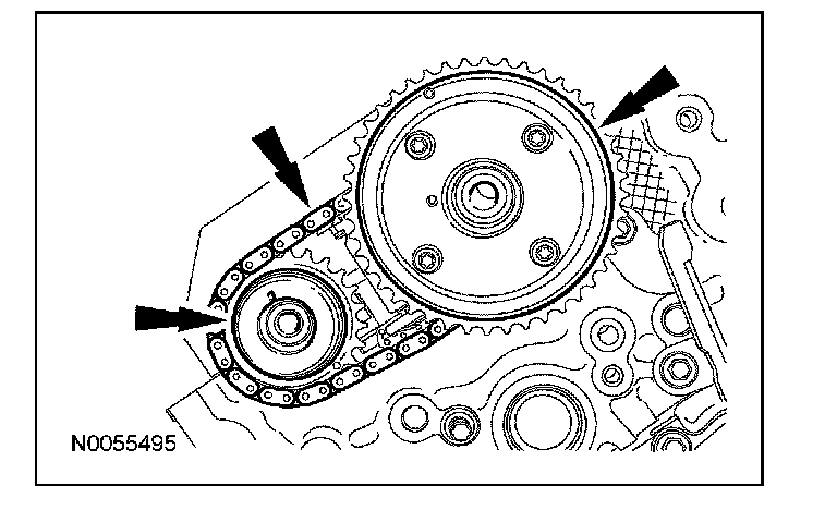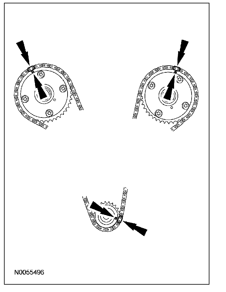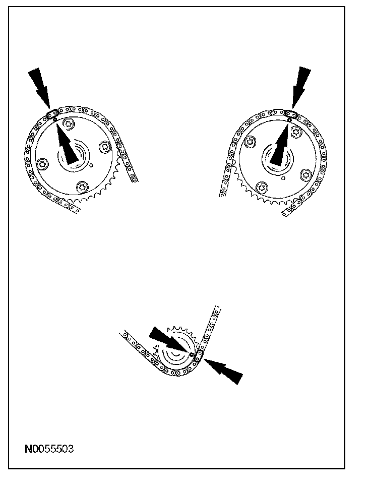 13. Install the primary timing chain with the colored links aligned with the timing marks on the VCT assemblies and the crankshaft sprocket.