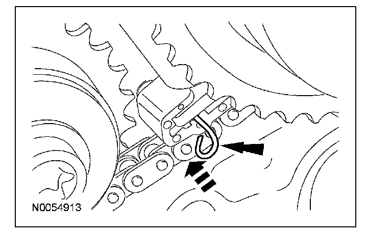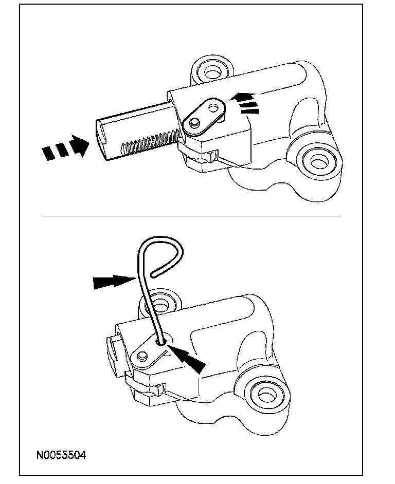 14. Compress the LH secondary timing chain tensioner and install a suitable lockpin to retain the tensioner in the collapsed position.