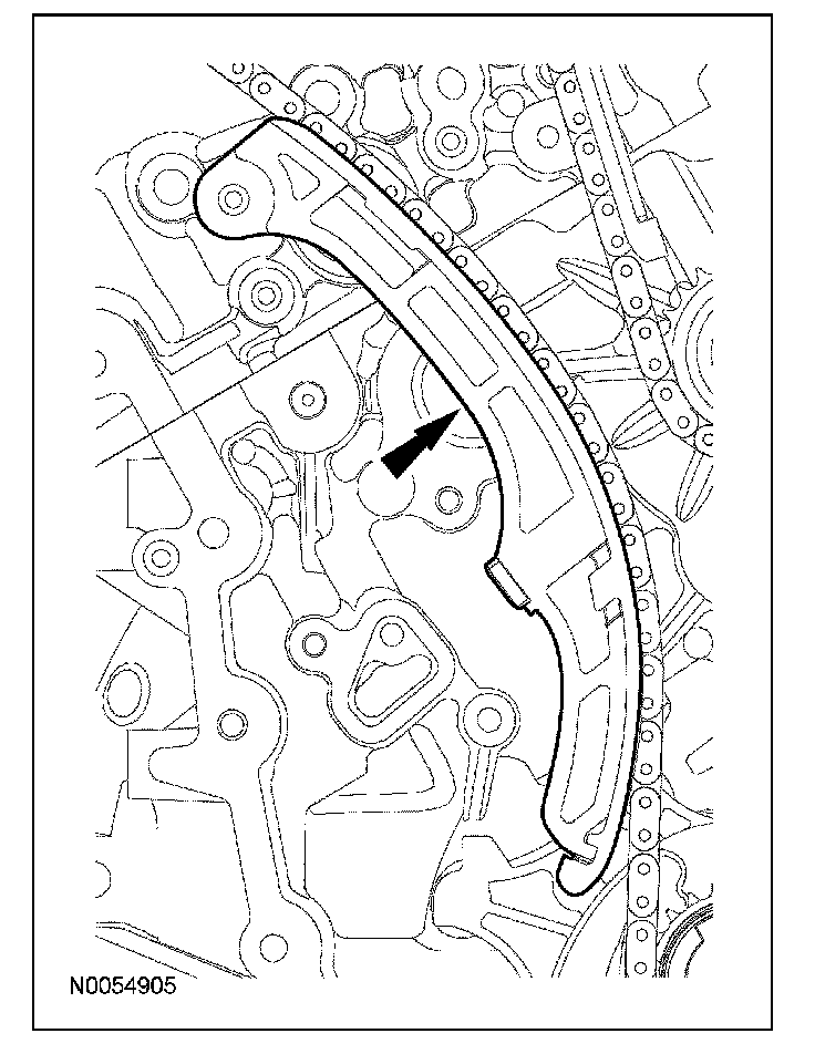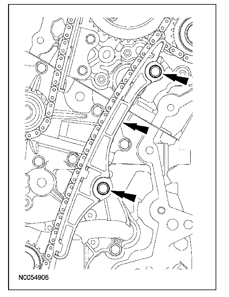 15. Install the lower LH primary timing chain guide and the 2 bolts.
