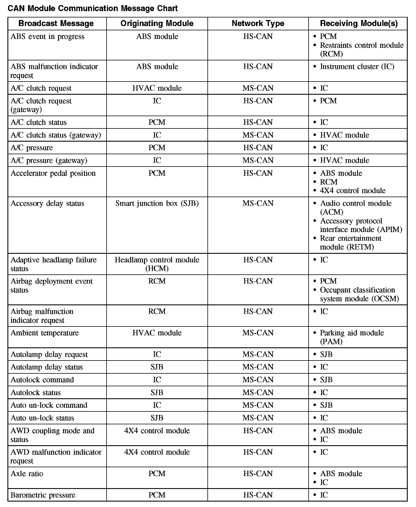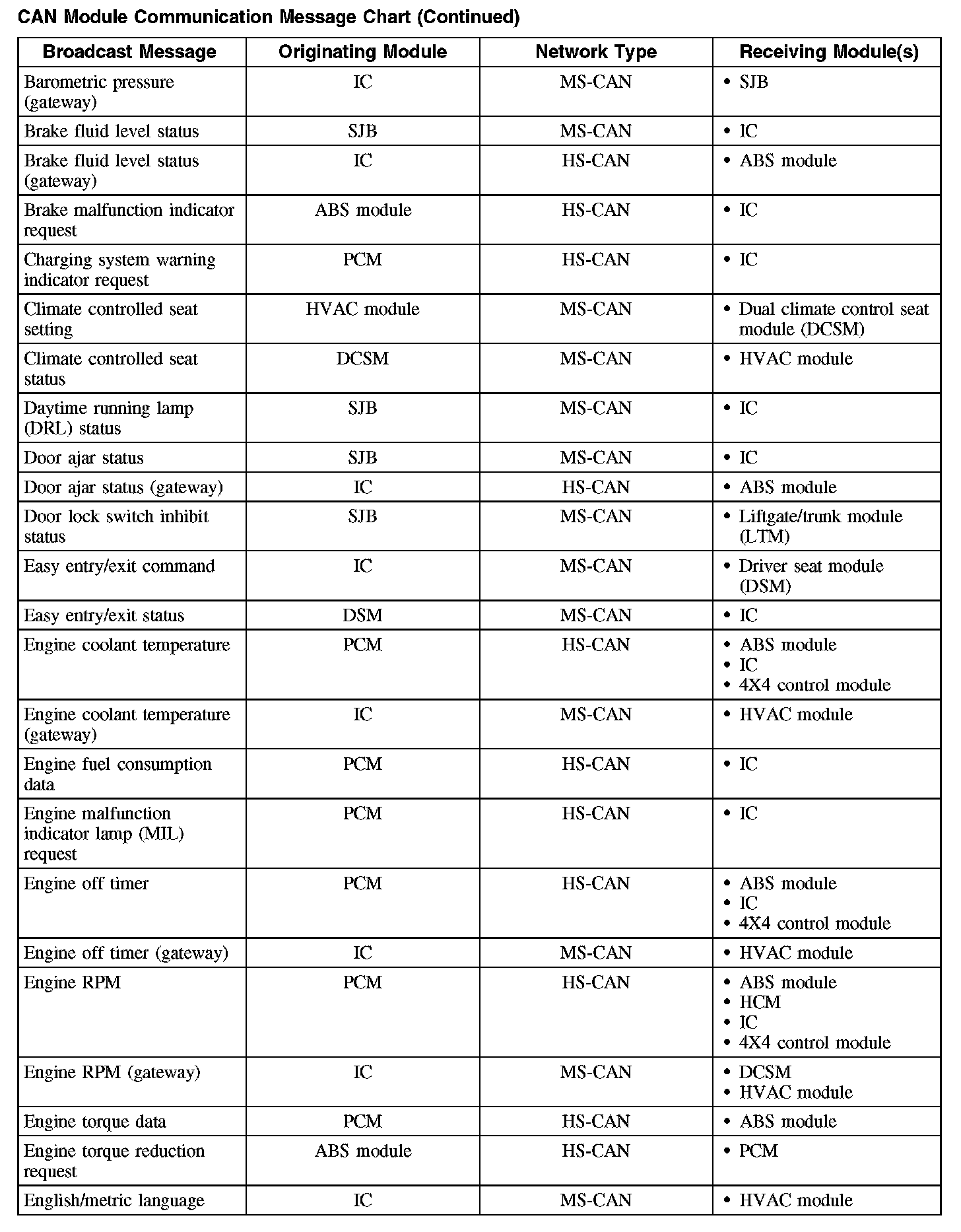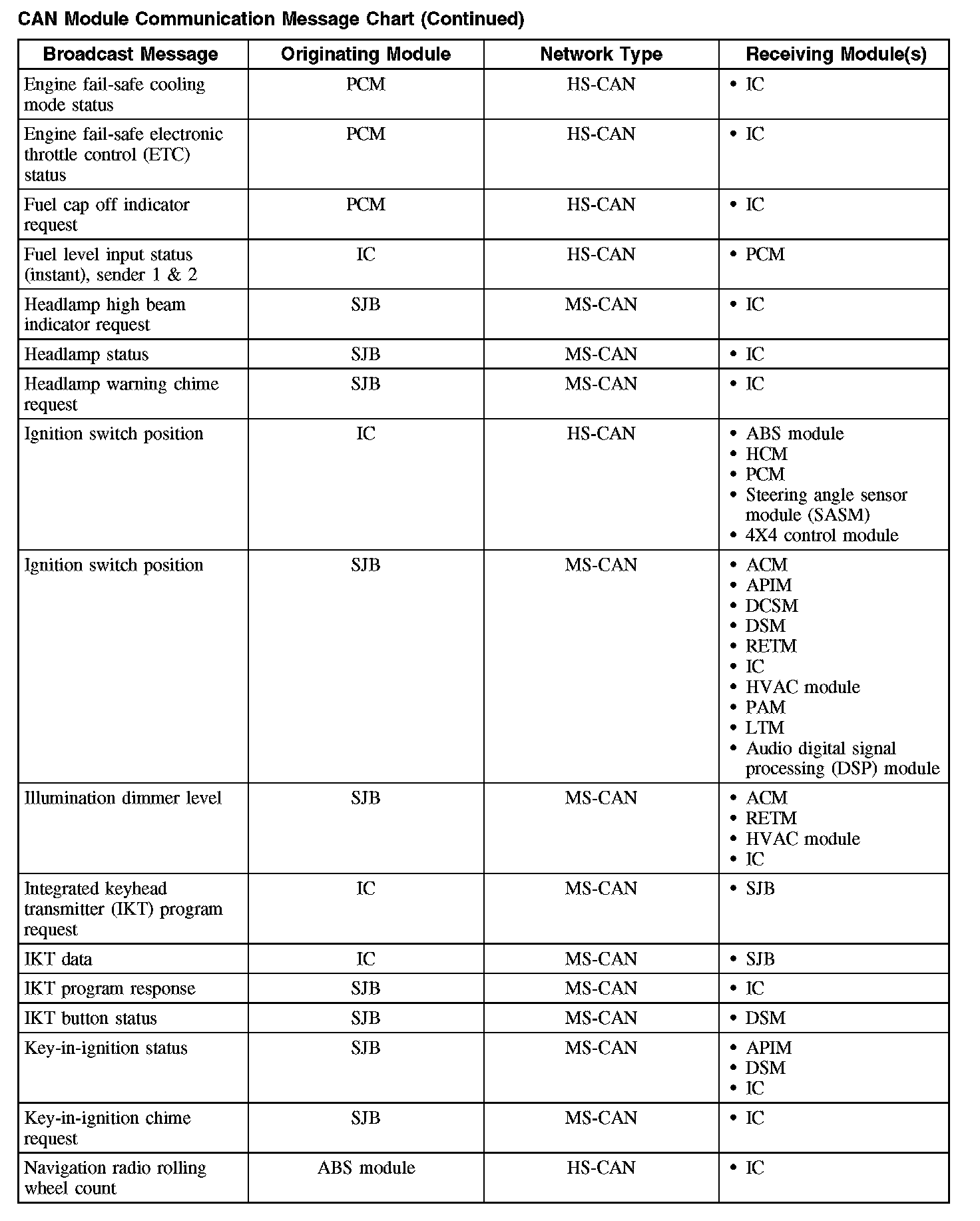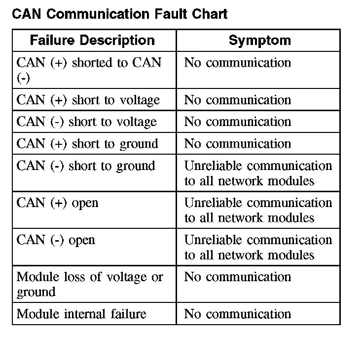 The following fault chart describes the specific CAN failures and their resulting symptom:
