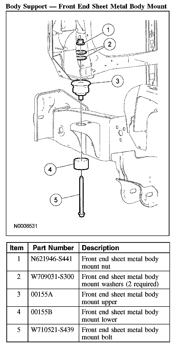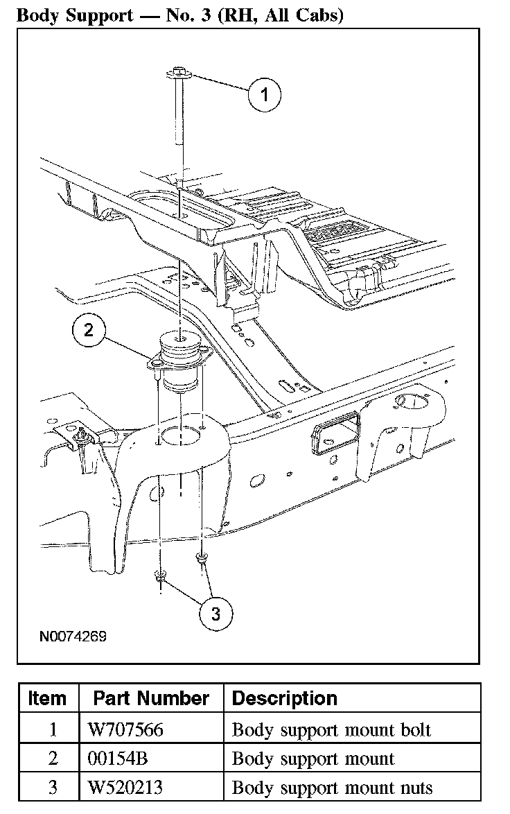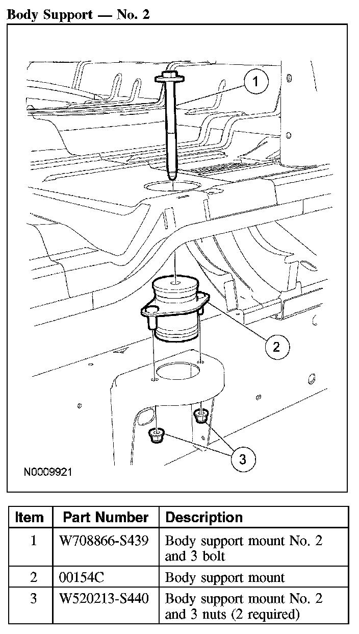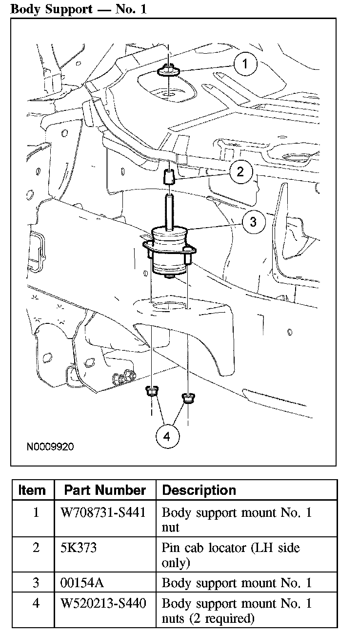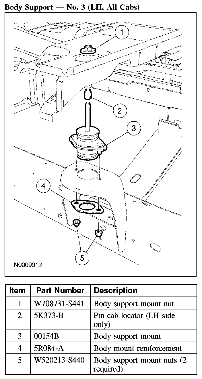 FRAME AND BODY MOUNTINGThe frame consists of 2 steel channel rails, a front crossmember, transmission support crossmember and a rear crossmember (trailer hitch). The side rails and welded crossmembers are not replaced separately. A front frame rail repair kit (5D058 and 5D059) is available if the front rail is to be repaired.