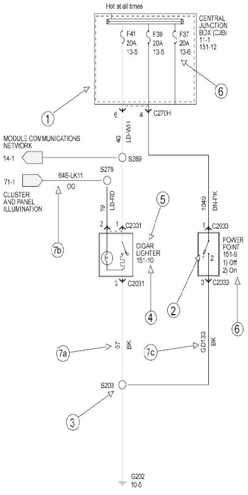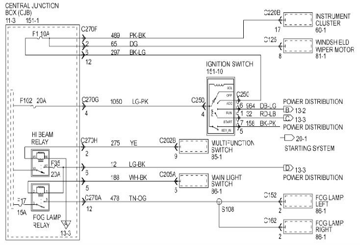 Ford Motor Company uses three different circuit numbering conventions: Standard Circuit Numbering System, Global Circuit Numbering System, and Next Global Circuit Numbering System (NGCNS). With each, the circuit number (which identifies a specific circuit function) is followed by the wire color.