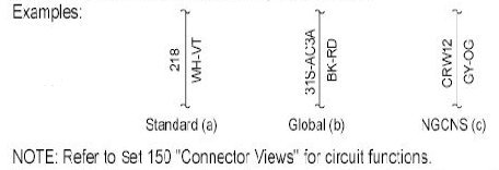 Connector Views show the views of the pins and/or cavities of all connectors. The pin and cavity sides are shown separately as if the connector were disconnected. The color of the connector housing is indicated next to the connector number when available. The harness causal number is located above the connector view and below the connector number. The circuit function charts are located below each connector. The wiring harness designations are listed in Component Location Charts.