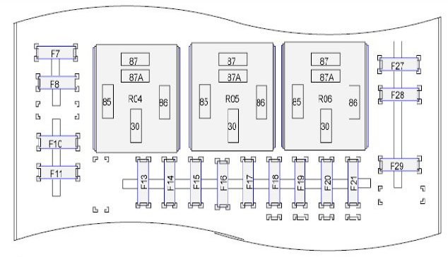 Fuse/Locations and Relay/Locations contains a view of the fuse/relay box, in which all fuses and relays are identified. Fuse and Relay Numbering and Naming. Fuse and relay numbering and naming follow the indication of the fuse panel cover.
