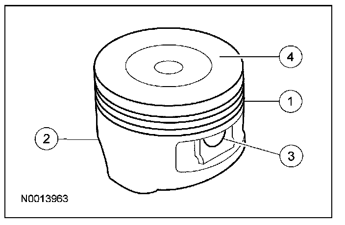1. Clean and inspect the (1) ring lands, (2) skirts, (3) pin bosses and the (4) tops of the pistons. If wear marks, scores or glazing is found on the piston skirt, check for a bent or twisted connecting rod.