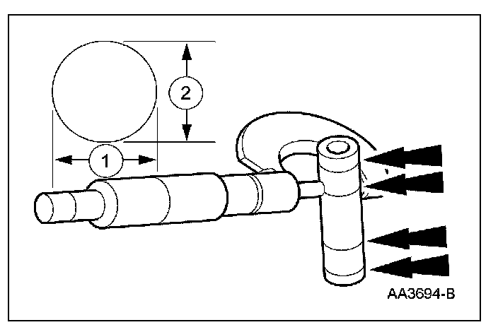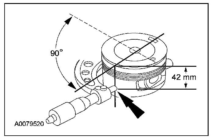 1. Measure the piston diameter 90 degrees from the piston pin and 42 mm (1.65 inch) down from the top of the piston at the point indicated.