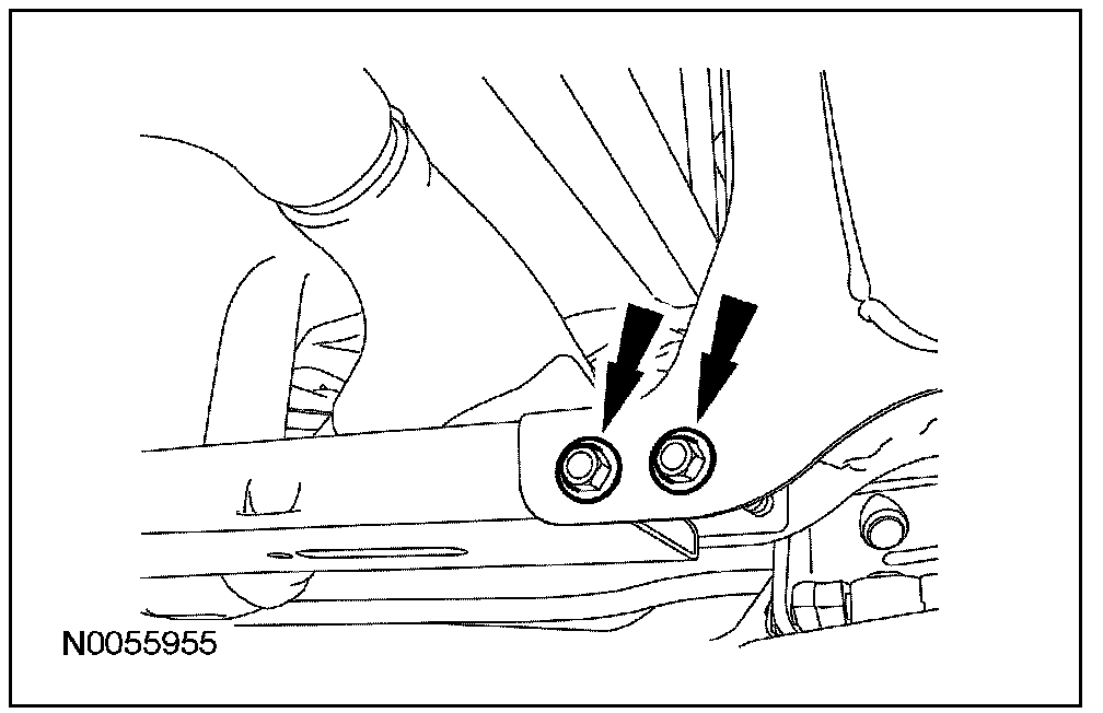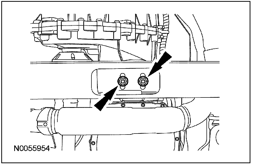 3. Remove the LH and RH exhaust heat shield-to-crossmember fasteners.