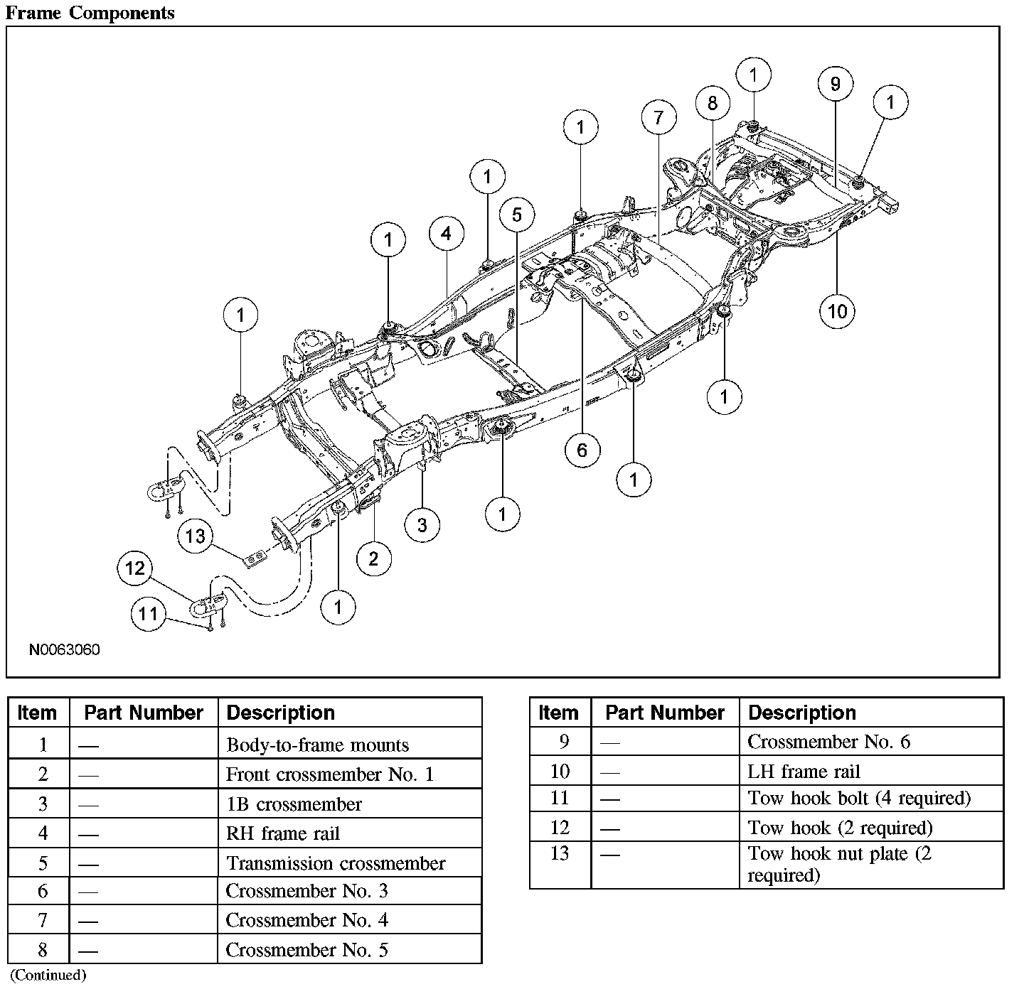 FRAME AND BODY MOUNTINGThe frame is made up of 2 steel boxed side rails and crossmembers, which are welded to the 2 side rails. The transmission crossmember is bolted to the side rails. The side welded rails and crossmembers are not replaced separately.