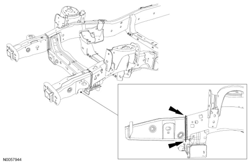 NOTICE: The following is step-by-step procedure for carrying out front frame horn replacement on Expedition/Navigator models. The Expedition/Navigator is a body on frame vehicle which is designed with energy absorbing features in the front frame horns to manage crash energy. The horn section of the frame MUST NOT be straightened if any holes or surfaces show evidence of collapse or buckling. If any evidence of damage exists BEHIND the first frame crossmember in terms of buckling or cracking, then the ENTIRE frame must be installed new.