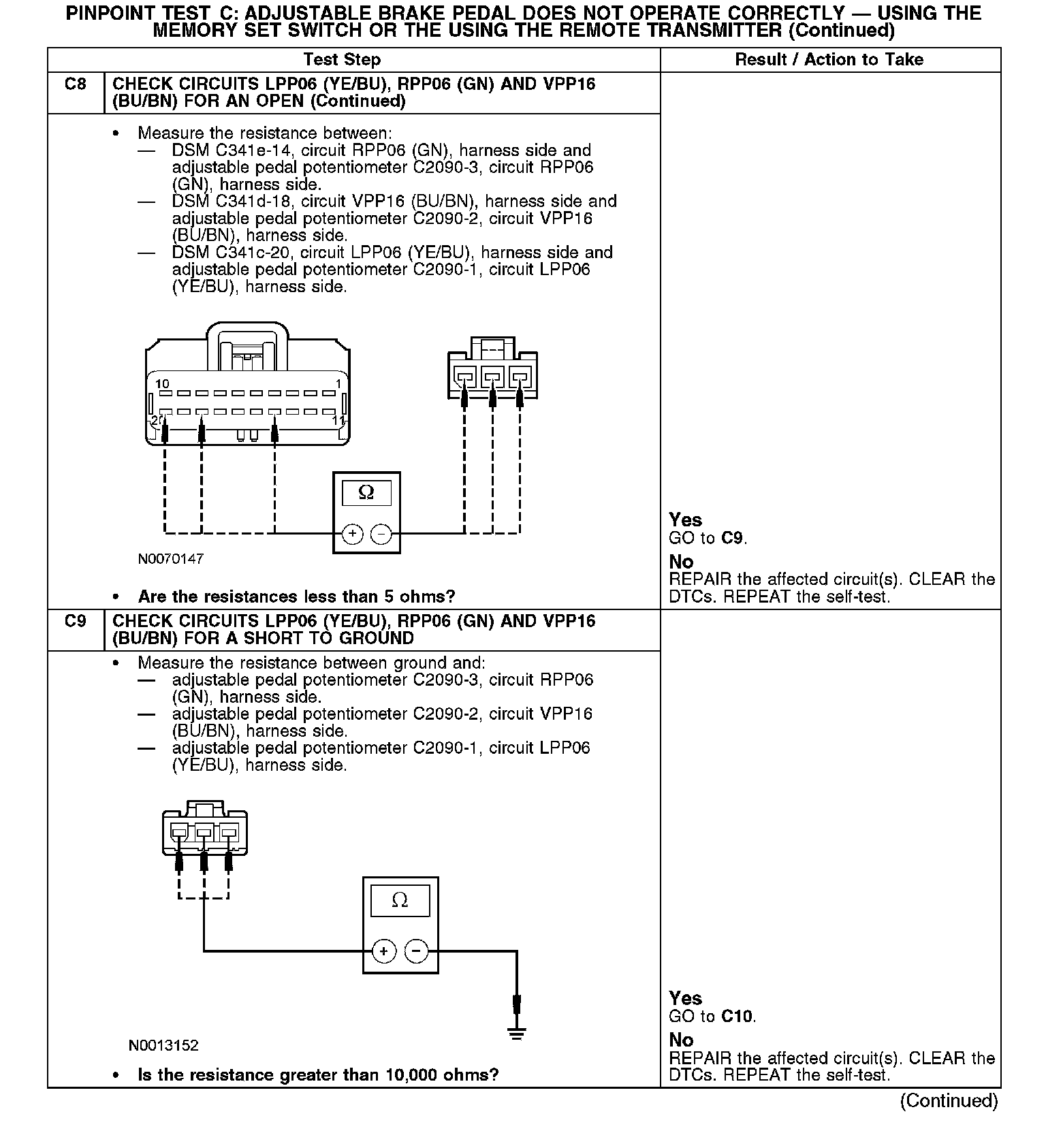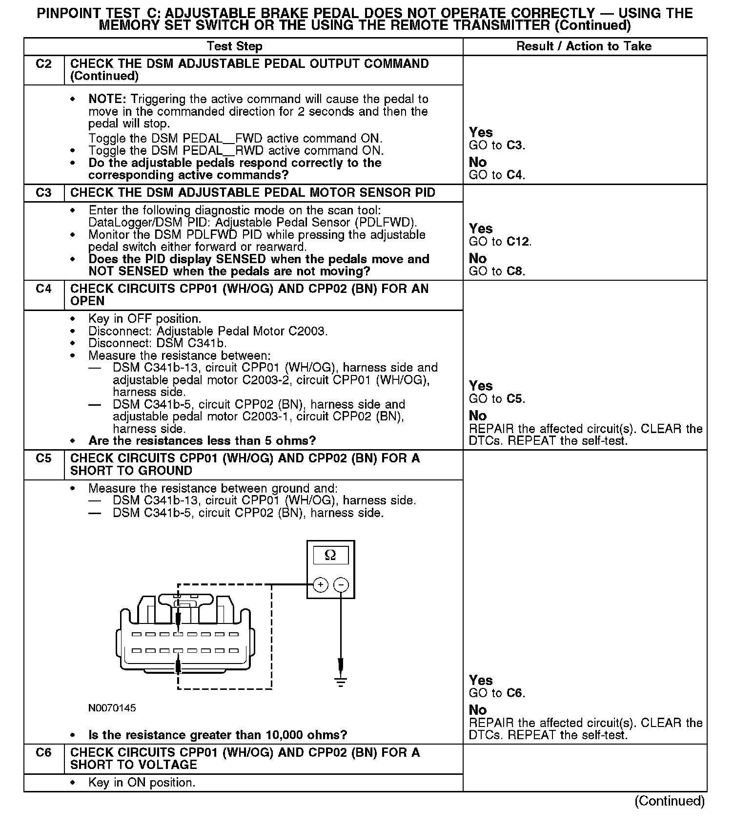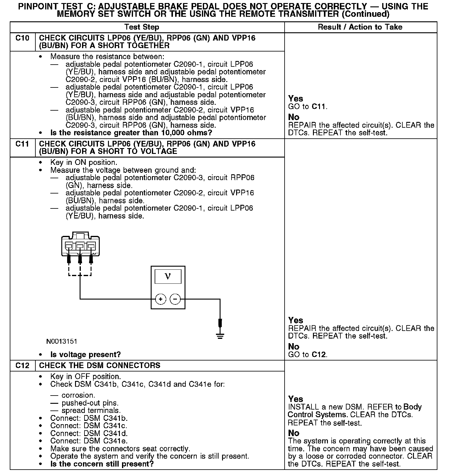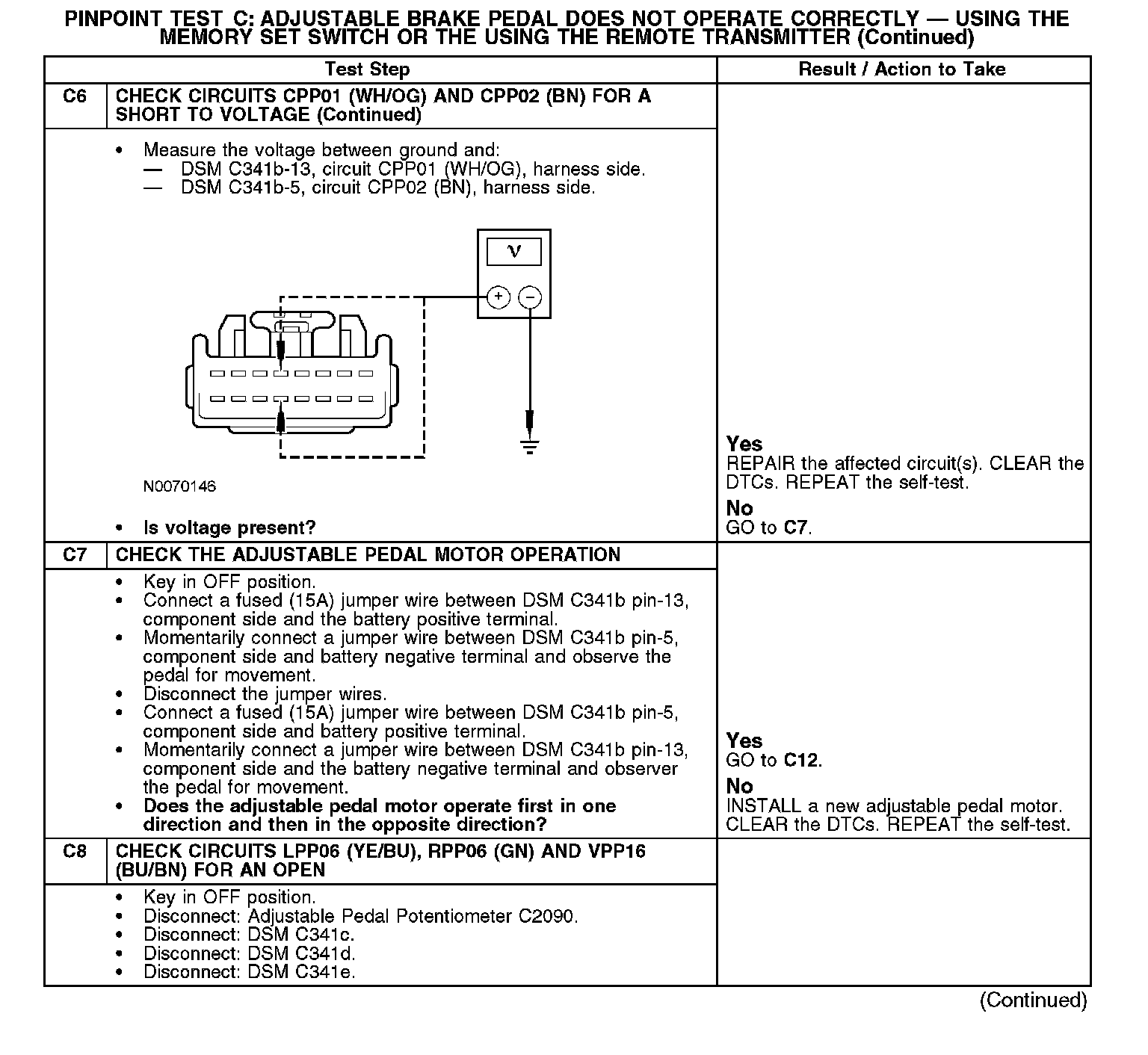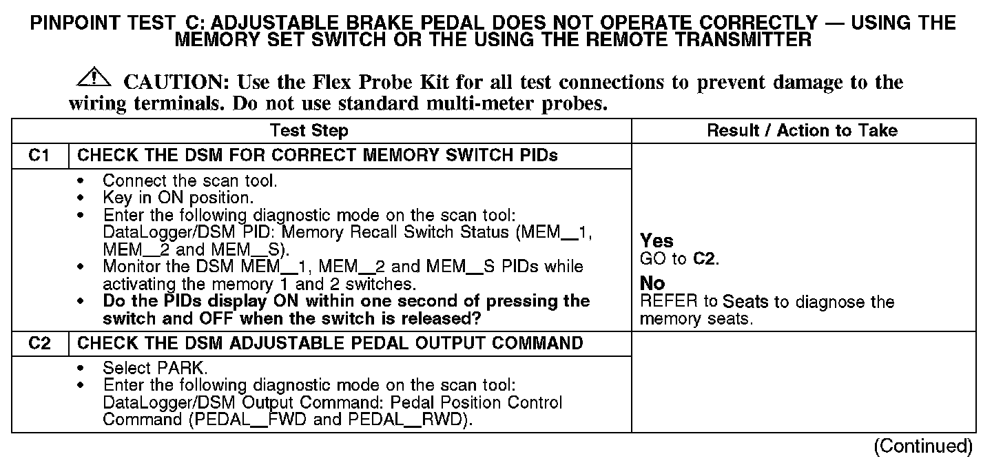 Pinpoint Test C: Adjustable Brake Pedal Does Not Operate Correctly - Using the Memory SET Switch or the Remote TransmitterRefer to Vehicle/Diagrams, Adjustable Pedals for schematic and connector information.