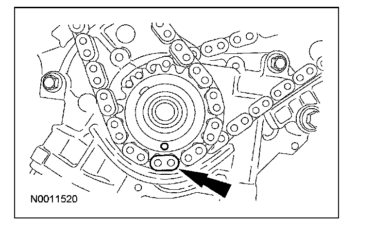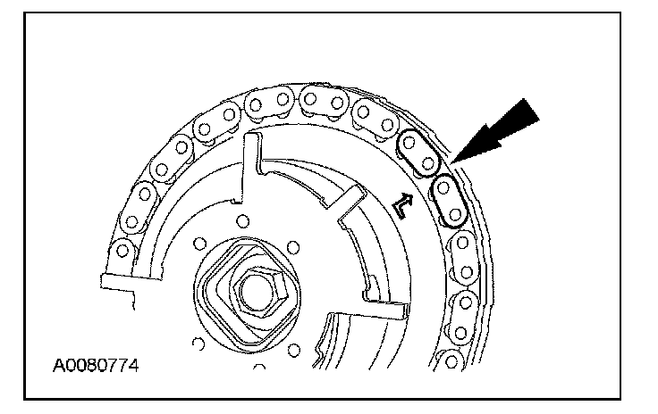 Position the RH timing chain on the VCT phaser sprocket with the timing mark positioned between the 2 copper (marked) chain links.