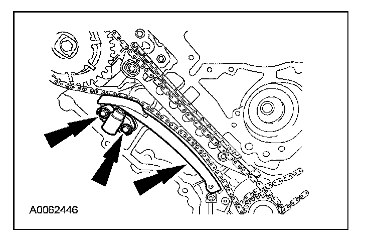 46. Position the RH timing chain tensioner arm on the dowel pin and install the RH timing chain tensioner and bolts.