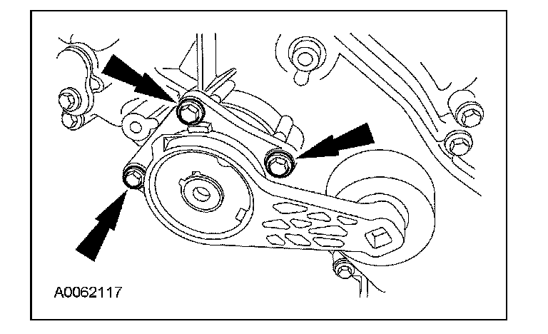 64. Position the accessory drive belt tensioner and install the 3 bolts.