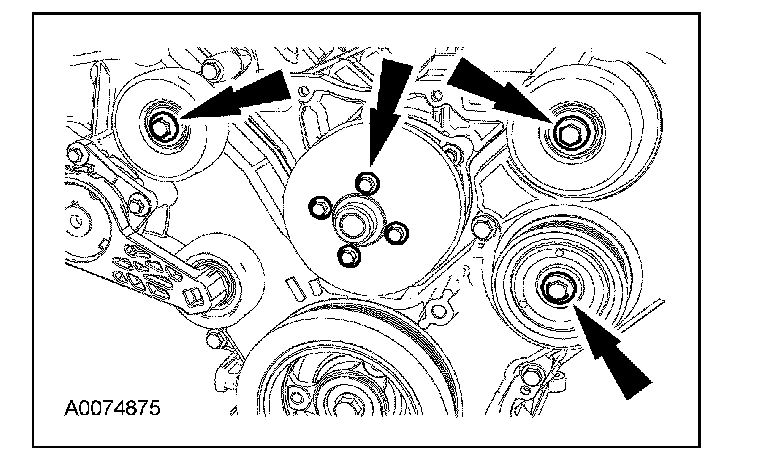 65. Install the 3 accessory drive belt idler pulleys, the coolant pump pulley and the 7 bolts.