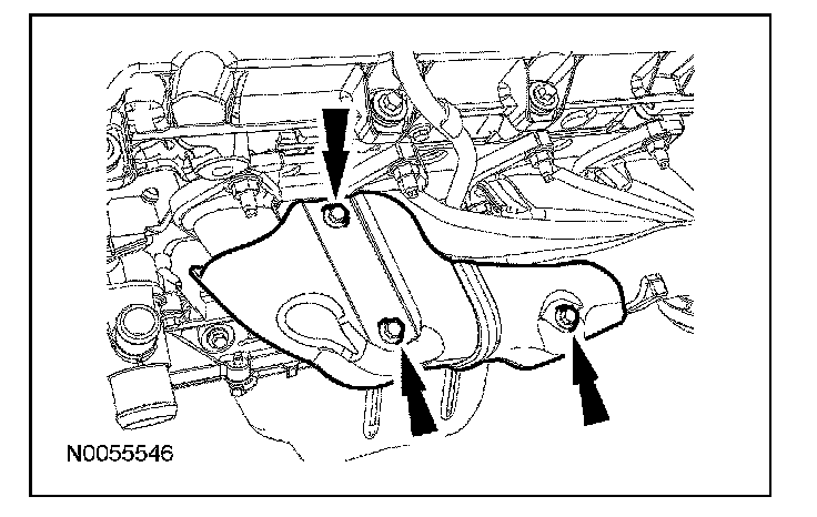 69. Position the exhaust manifold heat shield and install the 3 bolts.
