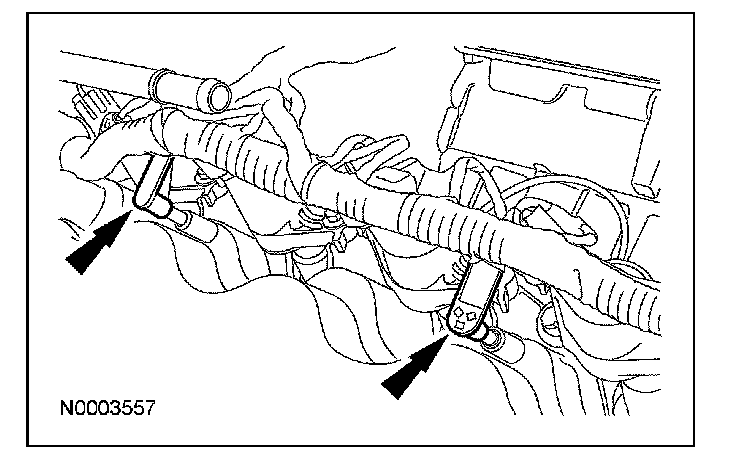 14. Disconnect the 2 engine wiring harness retainers from the RH valve cover studs.