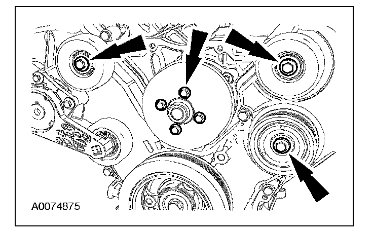 33. Remove the bolts, the coolant pump pulley and the 3 accessory drive belt idler pulleys.