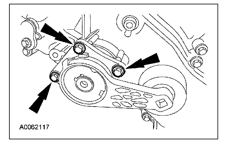 34. Remove the bolts and the accessory drive belt tensioner.