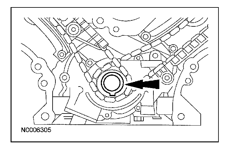 CAUTION: Only use hand tools to remove the variable camshaft timing (VCT) phaser sprocket assembly or damage may occur to the camshaft or VCT phaser sprocket.