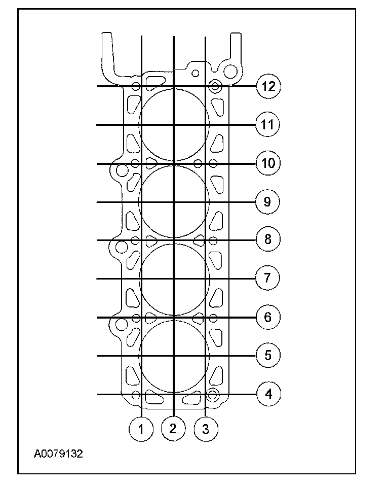 Using a straightedge and a feeler gauge, inspect the cylinder head for flatness in the sequence shown.