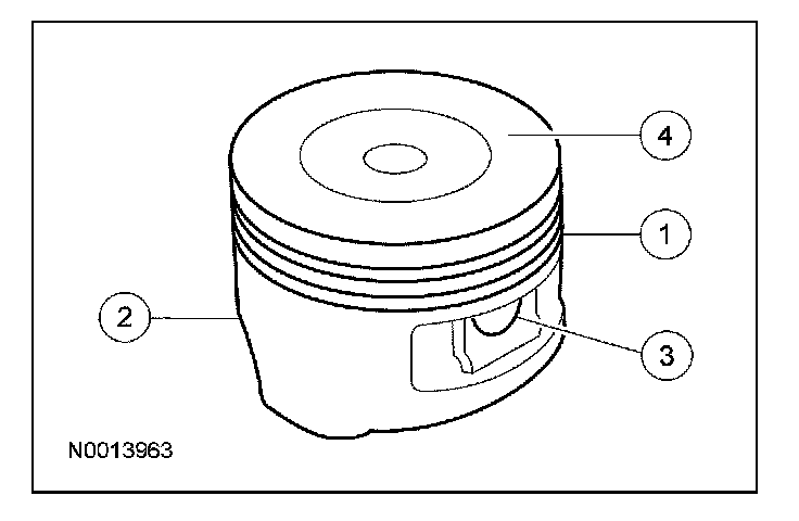 1. Clean and inspect the (1) ring lands, (2) skirts, (3) pin bosses and the (4) tops of the pistons. If wear marks, scores or glazing is found on the piston skirt, check for a bent or twisted connecting rod.