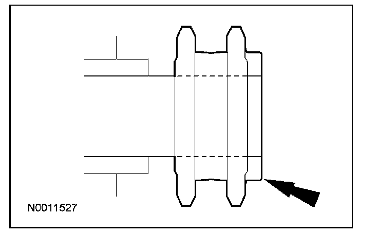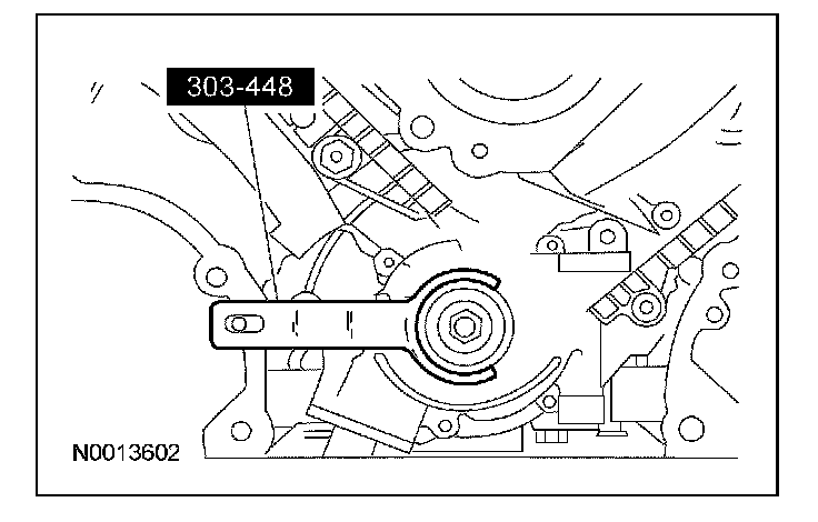 11. CAUTION: If one or both of the tensioner mounting bolts are loosened or removed, the tensioner-sealing bead must be inspected for seal integrity. If cracks, tears, separation from the tensioner body or permanent compression of the seal bead is observed, install a new tensioner. Failure to follow these instructions may result in engine damage.