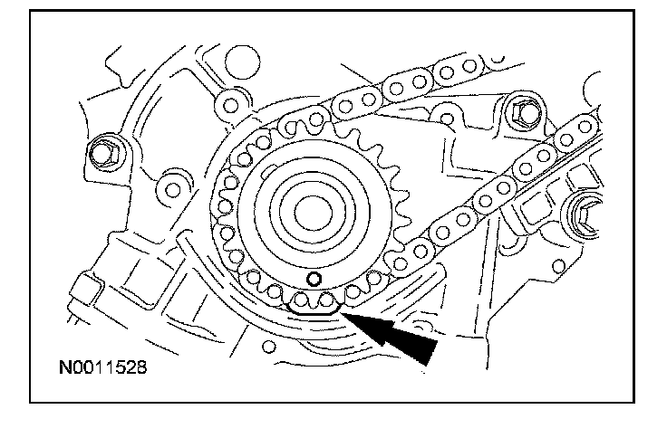 17. NOTE: The camshaft phaser and sprocket will be stamped with one of the illustrated timing marks for the RH camshaft.