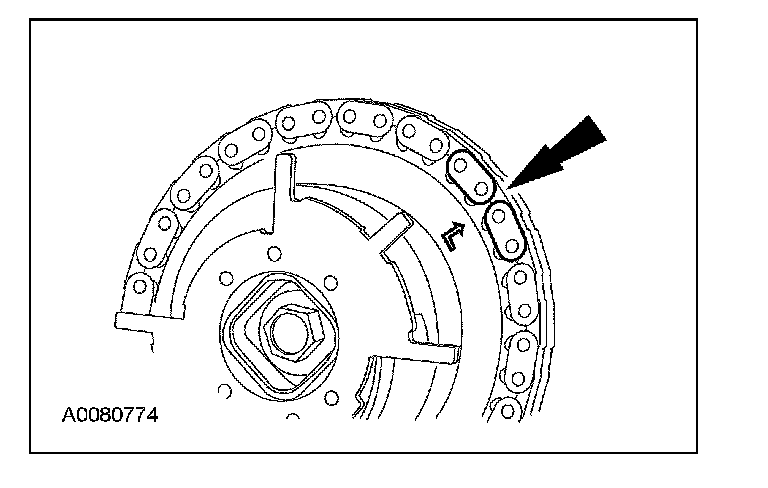 12. Position the lower end of the LH (inner) timing chain on the crankshaft sprocket, aligning the timing mark on the outer flange of the crankshaft sprocket with the single copper (marked) link on the chain.