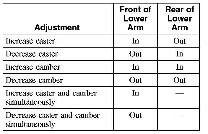 8. To adjust the caster and camber, refer to the following chart.