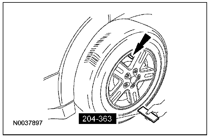 Place the activation tool on the LF tire sidewall opposite (180 degrees) from the valve stem. Press and release the test button on the special tool. The horn will sound briefly to indicate that the tire pressure sensor has been recognized by the SJB.
