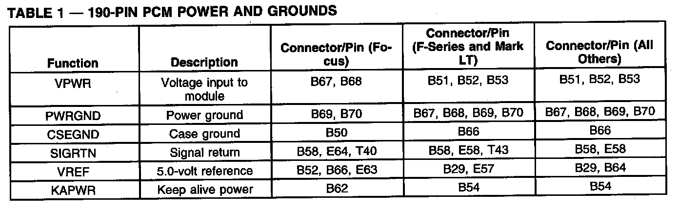 The center of the electronic engine control (EEC) system is a microprocessor called the PCM. The PCM receives input from sensors and other electronic components (switches, relays). Based on the information received and programmed into its memory, the PCM generates output signals to control various relays, solenoids and actuators. There are several different types of PCMs in use for this model year. Refer to the Vehicle PCM Application Table for PCM types and their applications.