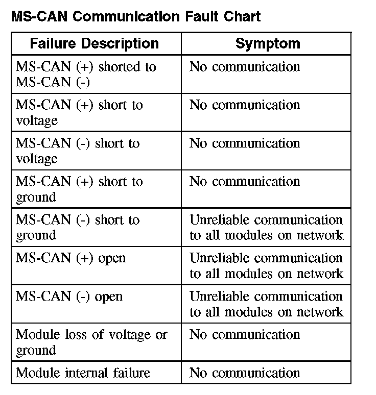 The following fault chart describes the specific MS-CAN failures and their resulting symptom: