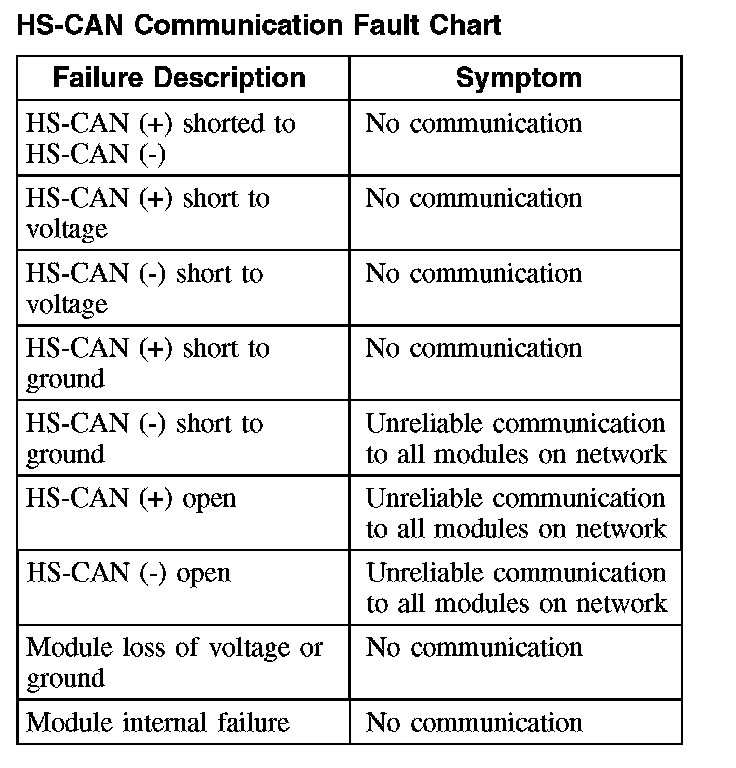 The following fault chart describes the specific HS-CAN failures and their resulting symptom: