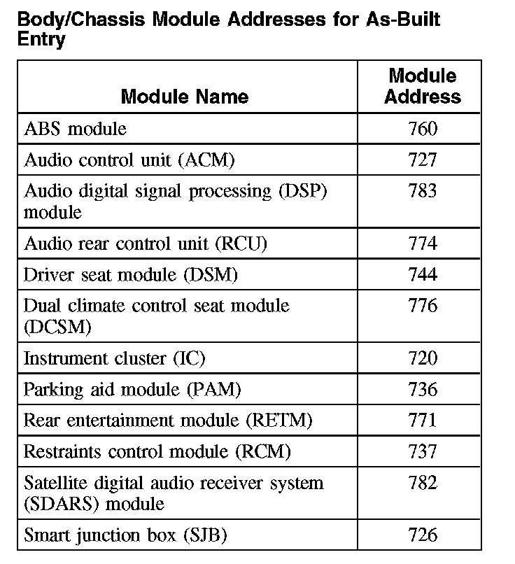 Body/Chassis Module Addresses for As-Built Entry: