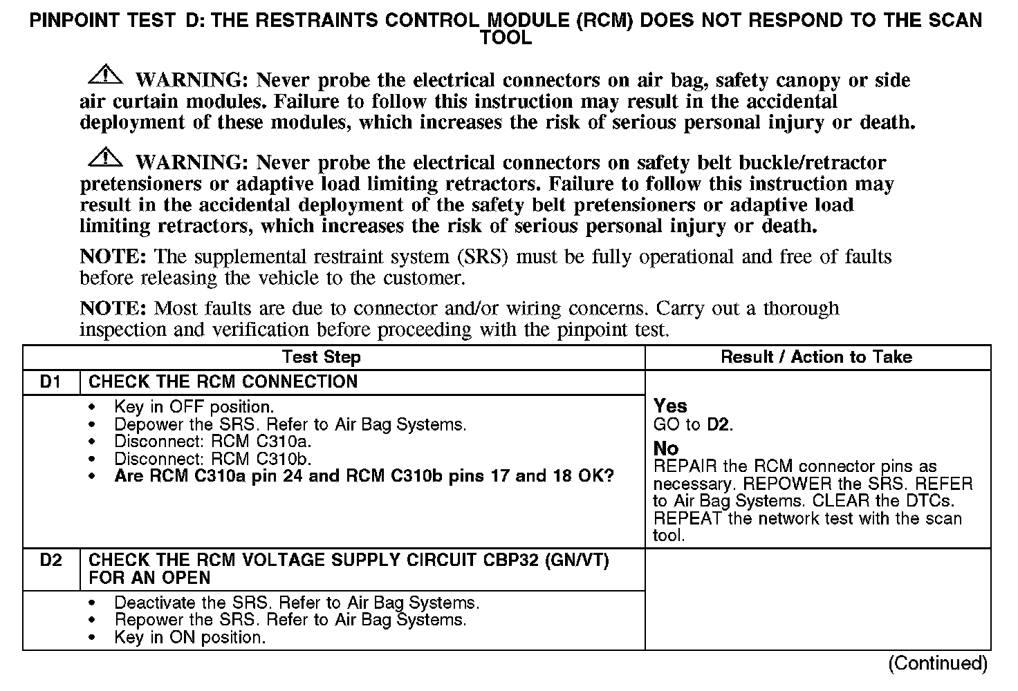 PINPOINT TEST D: THE RESTRAINTS CONTROL MODULE (RCM) DOES NOT RESPOND TO THE SCAN TOOLNormal Operation