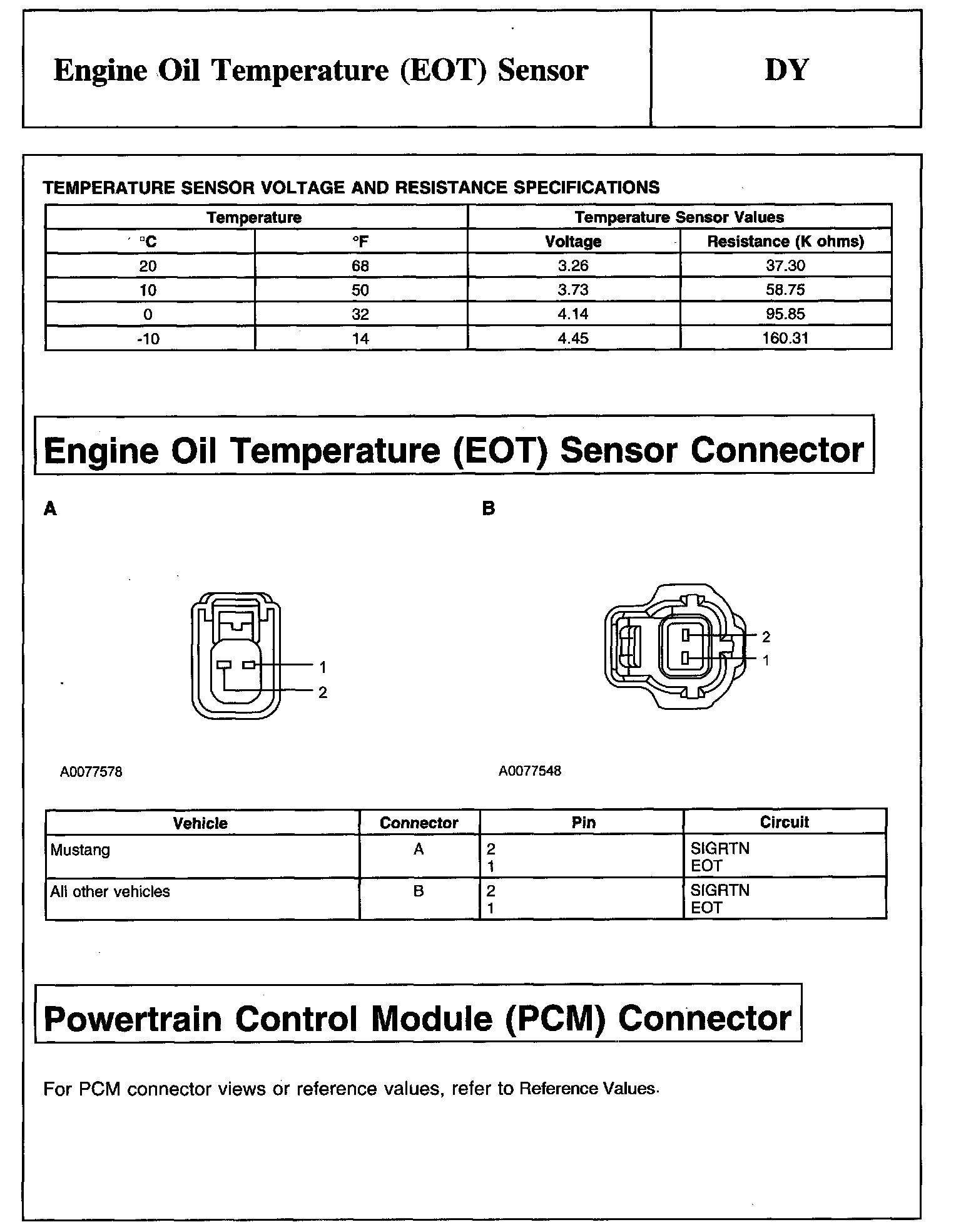 Temperature Sensor Voltage And Resistance Specifications, Engine Oil Temperature (EOT) Sensor Connector And Powertrain Control Module (PCM) Connector: