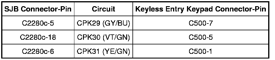 The Smart Junction Box (SJB) monitors for a ground signal on the reference circuits CPK29 (GY/BU), CPK30 (VT/GN), and CPK31 (YE/GN) for the keyless entry keypad. When an individual keypad button is pressed, an individual or combination of the reference circuits is routed to ground. The SJB then determines which button was pressed based on which circuit(s) are grounded. The keypad is grounded through circuit GD133 (BK). Once the SJB determines that the 5-digit personal entry code, or the factory set 5-digit entry code has been entered on the keypad, the SJB then energizes the driver door unlock relay to unlock the driver door.