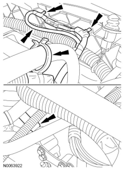 16. If equipped, detach the engine block heater harness from the radiator support, the A/C suction tube and the engine wiring harness.