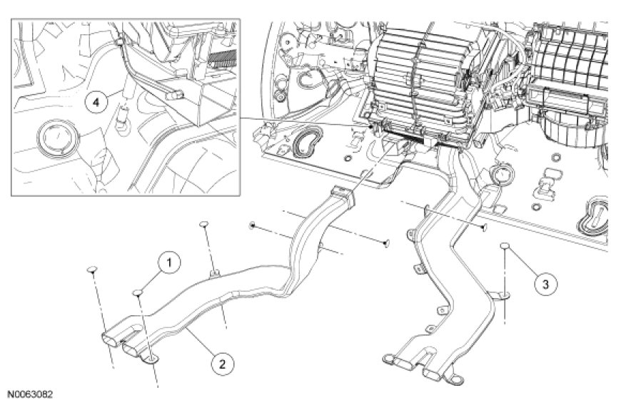 5. Remove the 4 LH rear footwell duct pin-type retainers and the LH rear footwell duct.