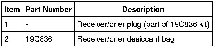 NOTE: Installation of a new receiver/drier desiccant bag is not required when repairing the A/C system, except when there is physical evidence of contamination from a failed A/C compressor or damage to the receiver/drier desiccant bag. Damage to the receiver/drier desiccant bag includes physical damage to the receiver/drier desiccant bag or moisture contamination. Moisture contamination results only from a complete loss of refrigerant and equalization of the refrigerant system pressure with atmospheric pressure for a period longer than one hour. If even a slight amount of positive refrigerant pressure is present in the system before repairs are carried out, the receiver/drier desiccant bag should not be replaced.