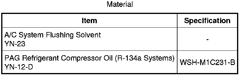 NOTICE: Receiver/drier desiccant bag, Thermostatic Expansion Valve (TXV), and hoses with mufflers should be removed when flushing the Air Conditioning (A/C) system. Internal plumbing of these devices makes it impossible to correctly remove any residual-flushing agent. These components are typically discarded after A/C system contamination. Hoses without mufflers can normally be reused unless they are clogged with foreign material. The 3.785L (1 gal) of A/C System Flushing Solvent YN-23 and FL1-A filter used in A/C Flush and Purge Machine 219-00022 are intended for use on one vehicle only. They may be used to flush both the A/C condenser core and the A/C evaporator core on an individual vehicle, but under no circumstances should they be used on more than one vehicle.