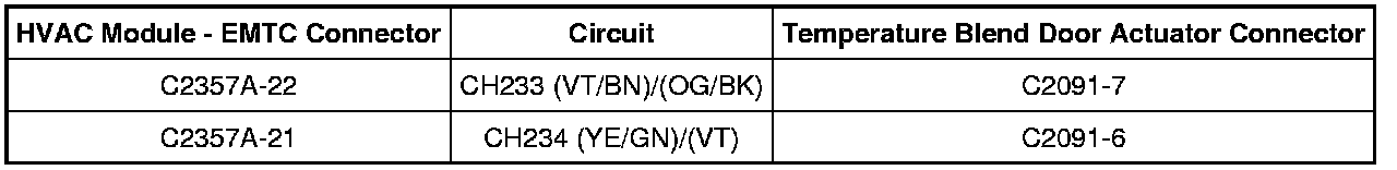 - HVAC module - EMTC C2357A-23, circuit GD115 (BK/GY), harness side and HVAC module - EMTC C2357A-22, circuit CH233 (VT/BN), harness side.